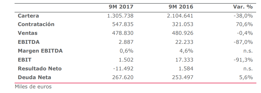 La cartera del grupo, se ha visto negativamente afectada por la eliminación de cuatro proyectos que suman 918 millones de euros. Así el importe actual de la cartera, que asciende a 1.306 millones de euros, asegura 1,8 años de actividad considerando las ventas de 2016.
