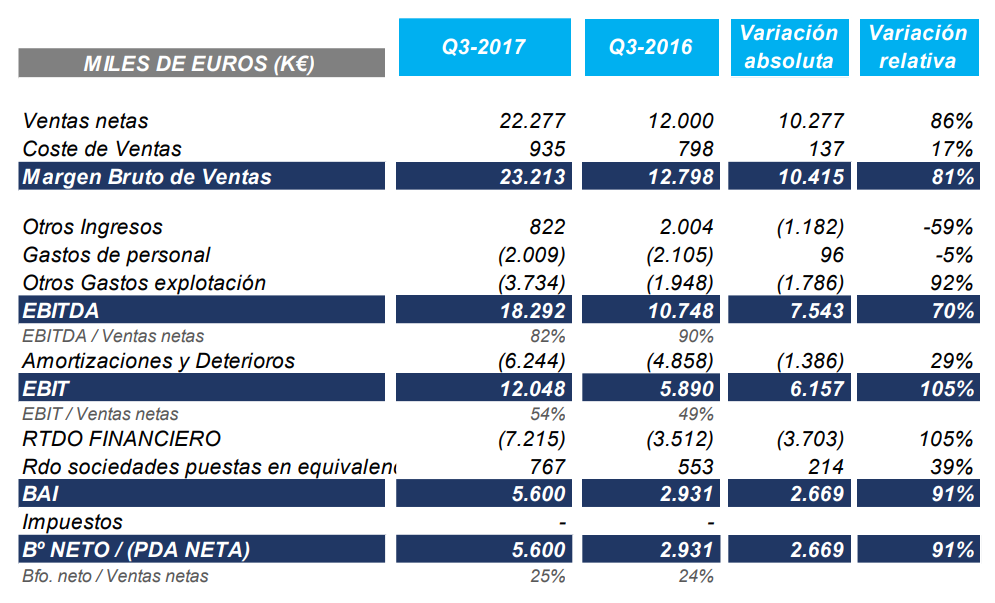 Las ventas netas del grupo alcanzaron los 22,27 millones de euros, un 86% más, al tiempo que el ebitda, se elevó un 70%, hasta los 18,29 millones.