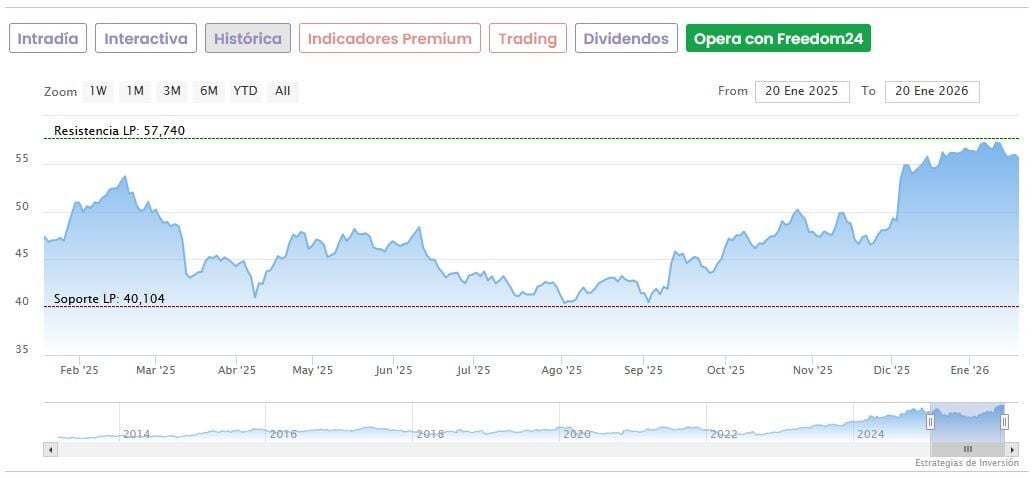 Aparte de Naturgy, la otra gran inversión en Bolsa en España es las que mantiene en Inditex (0,28%). Lo cierto es que las dos han tenido un comportamiento positivo en los últimos 12 meses, aunque moderado en comparación con otros miembros del IBEX 35. Naturgy ha subido un 11,5% en el último año, mientras que Inditex se ha anotado un 12,25%, si bien ha corregido un 4% desde que el 7 de enero tocó un máximo histórico de 57,74 euros.