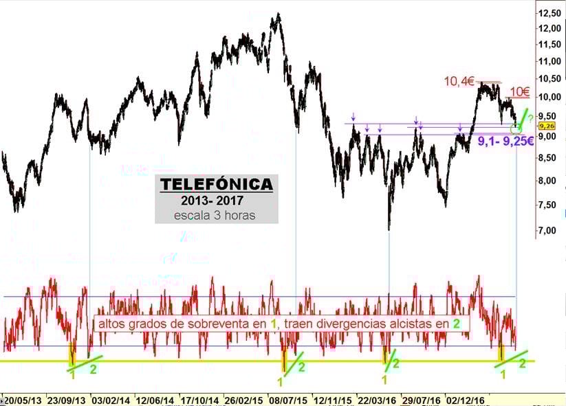 En el primer gráfico la expongo en escalas intradiarias desde el año 2013. Como vemos, las divergencias alcistas entre precio e indicadores técnicos son poco frecuentes, ocasionando todas ellas suelos temporales.