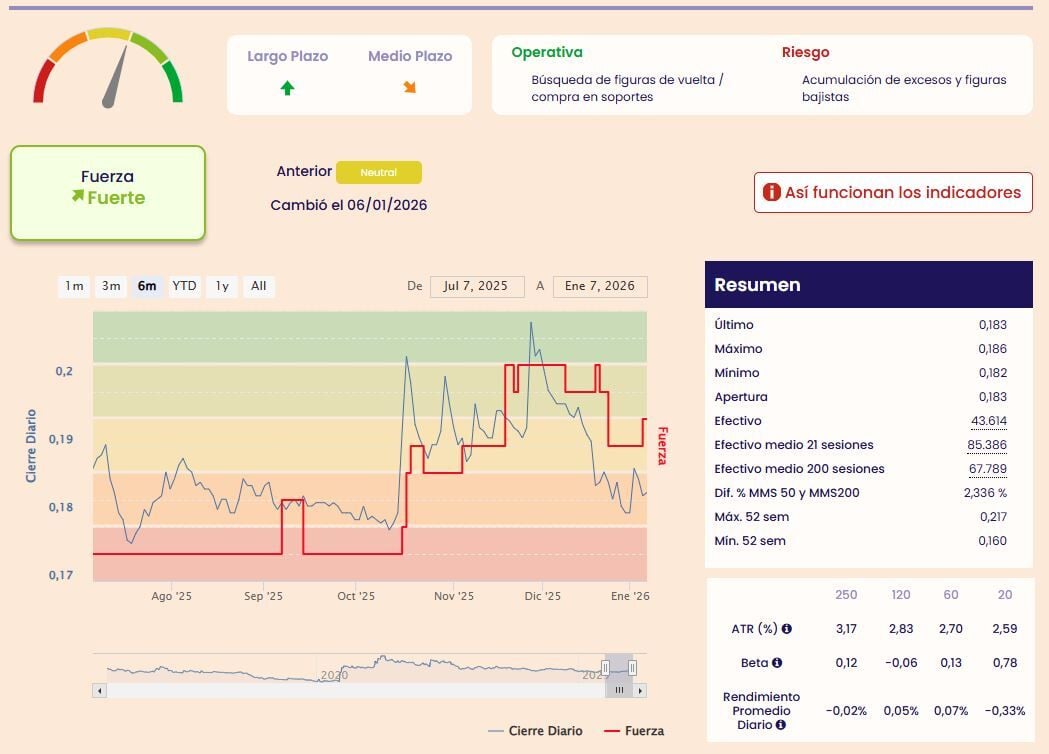 Entre los valores por debajo de 1 euro, por ejemplo, Deoleo se encuentra ‘fuerte’ después de que el pasado 6 de enero diese el salto desde el anterior ‘neutral’. Las acciones de la compañía detrás de marcas como Carbonell o Koipe bajan un 1,3% en los últimos 12 meses, pero suben un 18% desde sus mínimos del 7 de abril del año pasado, cuando llegaron a caer a 16 céntimos.