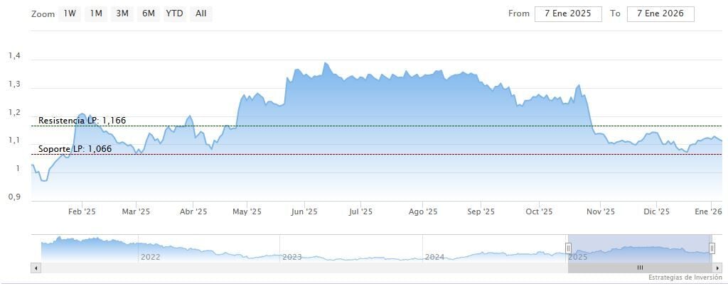 Ligeramente por encima del euro cotiza Línea Directa, que se encuentra ‘débil’ en el Mercado Continuo desde noviembre del año pasado, cuando dio el cambio desde ‘neutral’, de acuerdo con los indicadores de fuerza. Las acciones de la aseguradora suben un 7% en los últimos 12 meses, si bien hay que tener en cuenta que caen un 23% desde que en junio del año pasado tocaron un máximo de 1,44 euros. Su punto más bajo de las últimas 52 semanas está fijado en los 99,10 céntimos de euro desde enero del año pasado. Desde entonces, rebotan un 12%.