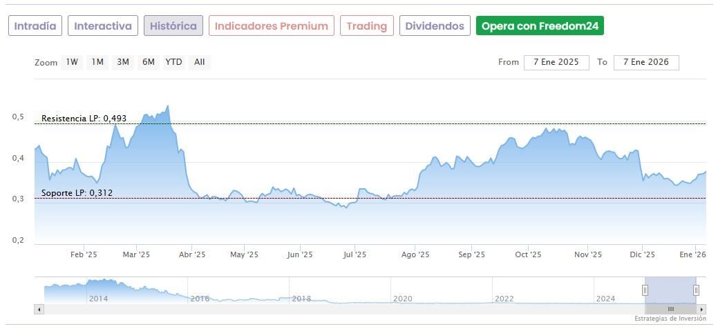 Con vistas al futuro, los analistas fundamentales que cubren a la compañía le otorgan mayoritariamente una recomendación de ‘comprar’, según los datos recopilados por Reuters. El precio objetivo de consenso es de 33 céntimos de euro por acción, lo que se traduce en un potencial alcista de un 74,6% frente a la cotización actual.