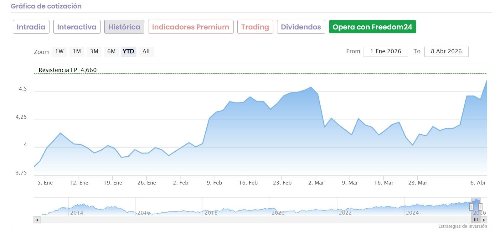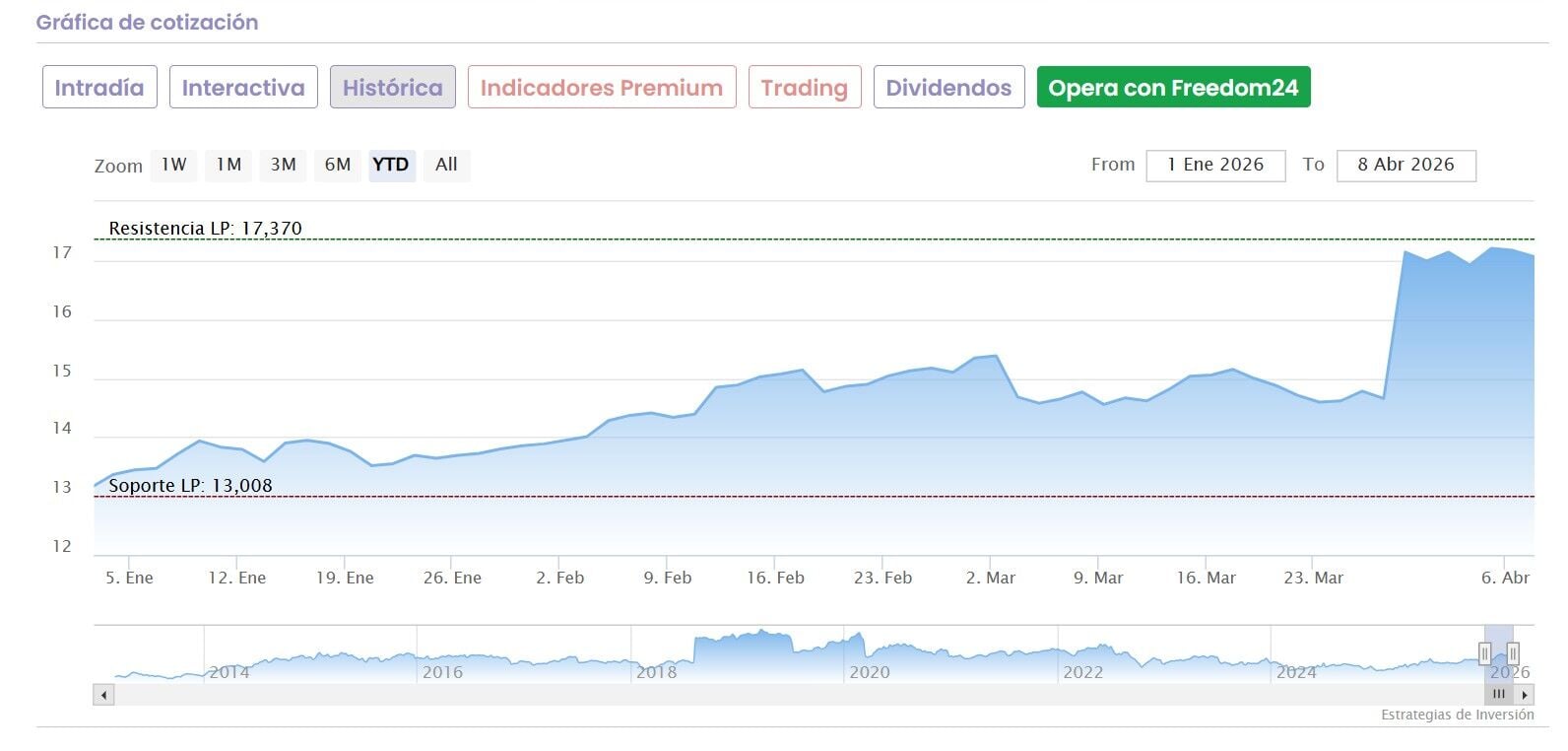 Además los Indicadores Premium de Estrategias de Inversión marcan un nivel técnico de muy fuerte para sus acciones, mientras que se considera infravalorada desde el punto de vista fundamental.