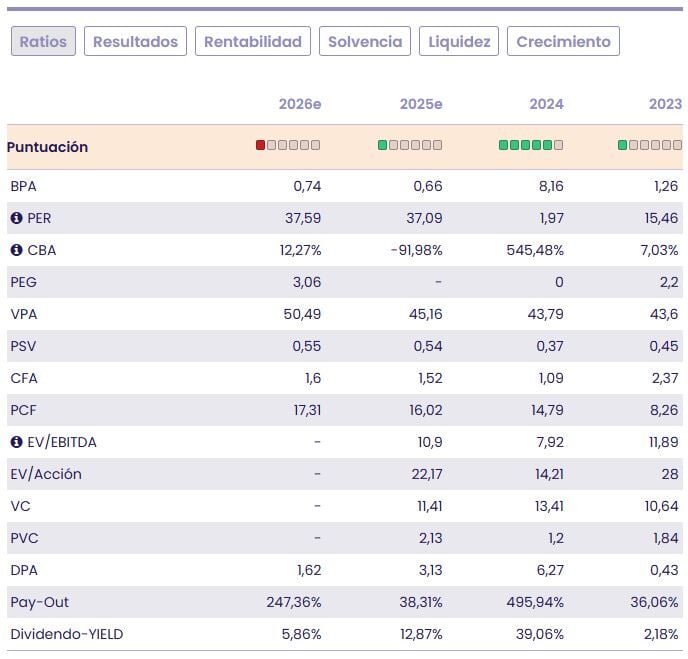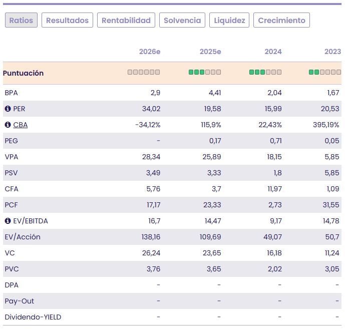 Pero hay algunos valores que superan estos múltiplos. Es el caso, por ejemplo, de Elecnor, con un PER 2026 de 37,59x. Las acciones de la compañía suben un 73,3% en los últimos 12 meses y eso que han caído un 7,77% desde sus máximos de las últimas 52 semanas, el 8 de diciembre en 30,90 euros. Los mínimos de este período fueron en abril del año pasado (15,08 euros), con una subida del 89% desde entonces.