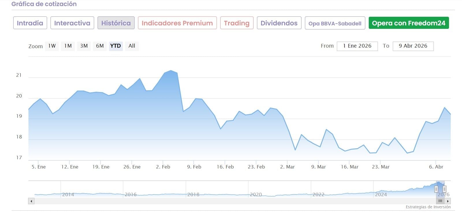 En cuanto a la media del mercado, en el caso de BBVA, el consenso de analista que recoge Reuters recomienda comprar sus acciones con precio objetivo que marca en los 21,48 euros por acción, lo que le otorga un posible recorrido alcista desde sus actuales niveles de cotización del 10,8%.