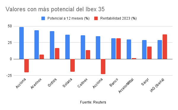 Al frente de todos ellos se encuentra Acciona. La compañía presidida por José Manuel Entrecanales ofrece un potencial a doce meses vista de un 48,8%. De acuerdo con los datos recopilados por Reuters, los analistas sitúan el precio objetivo en los 197,7 euros. El valor ha tenido un comportamiento bastante flojo en lo que va de 2023, con una caída acumulada en lo que va de ejercicio de más de un 20%.