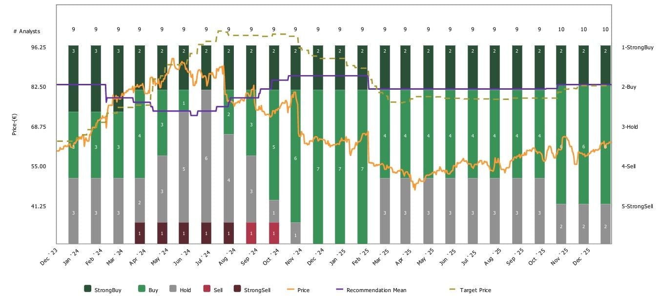 Desde el consenso que recoge Reuters el valor tiene una expectativa media de subida del 22% en su potencial con precio objetivo de 76,41 euros por acción y recomendación de compra sobre sus acciones.