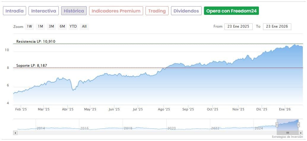 Renta 4 da un precio objetivo a Caixabank de 10,25 euros por acción, por debajo de la cotización actual. Las acciones del banco acumulan una fuerte subida de un 85,5% en los últimos 12 meses, habiendo llegado a alcanzar el pasado 14 de enero unos máximos históricos de 10,91 euros. Desde entonces, han corregido un 2,3%.