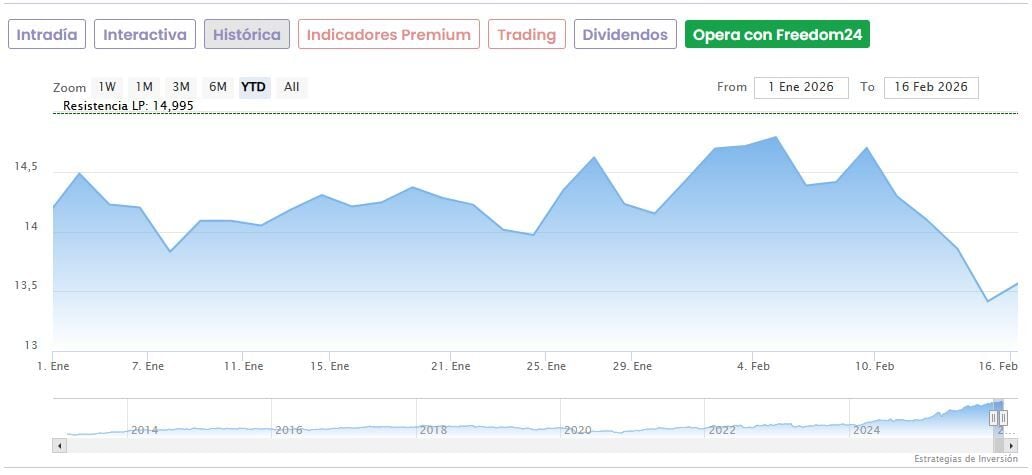 Las acciones de Bankinter han caído un 9,2% en las últimas dos semanas, desde que el 4 de febrero marcaron un máximo de 14,995 euros, y se encuentran ya en terreno negativo (-3,7%) en lo que va de 2026. No obstante, todavía suben un jugoso 77% desde sus mínimos de las últimas 52 semanas, situados en los 7,70 euros desde abril del año pasado.