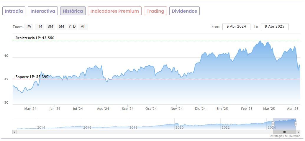 Las acciones llegaron a alcanzar unos máximos de 43,66 euros el 18 de febrero, pero desde entonces han caído un 10,5%, afectadas por la incertidumbre que ha traído a los mercados el presidente de EEUU, Donald Trump. No obstante, todavía suben un 20,8% desde sus mínimos de las últimas 52 semanas, situados en 32,341 euros desde el 19 de abril del año pasado.