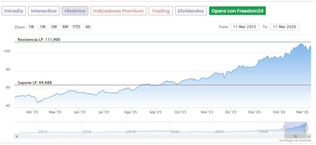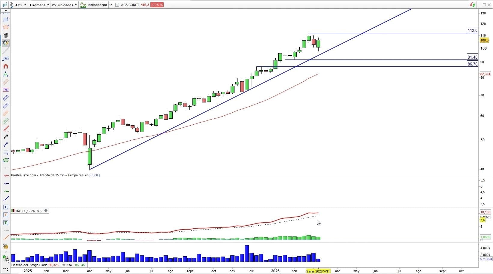La acción se encuentra muy cerca de los máximos anuales en el área de los 112 euros que conquistó a finales de febrero, antes de que estallase el conflicto de Irán, destaca el experto. “Seguiremos manteniendo a ACS como uno de los más fuerte del sector de materiales básicos siempre que se mantenga por encima del área de soporte entre los 86,70 y lo 91,40 euros por acción”.