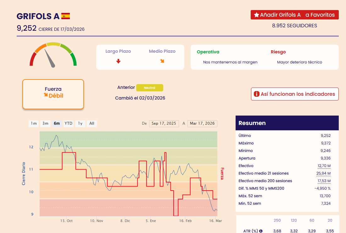 Según los indicadores premium de fuerza y tendencia ( línea color rojo) sobre Grifols , podemos ver que el valor se encuentra débil y con tendencia bajista a largo y medio plazo, por lo que no deberíamos de entrar en el valor en este momento, hasta que los indicadores premium nos den señal de pasar a fuerte o muy fuerte.