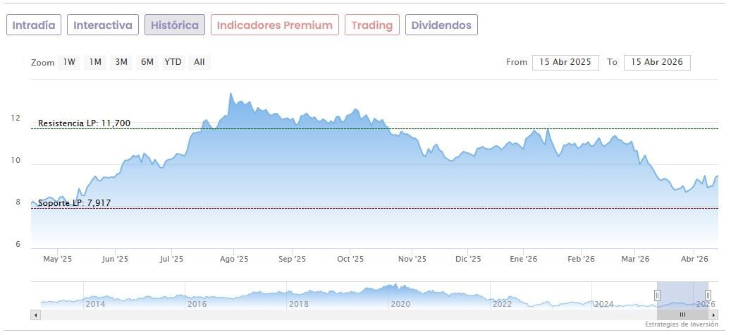 Las acciones de Grifols están teniendo un primer tercio del año complicado, acumulando una caída en lo que va de 2026 de un 10%. Si se pone el foco en sus últimos 12 meses, su punto más alto lo tocó el 31 de julio del año pasado en los 13,70 euros, con una caída de un 29,8% desde entonces. Sus mínimos del período se remontan al 16 de abril del año pasado, cuando cayó hasta los 7,978 euros. Desde entonces, rebota un 20,5%.