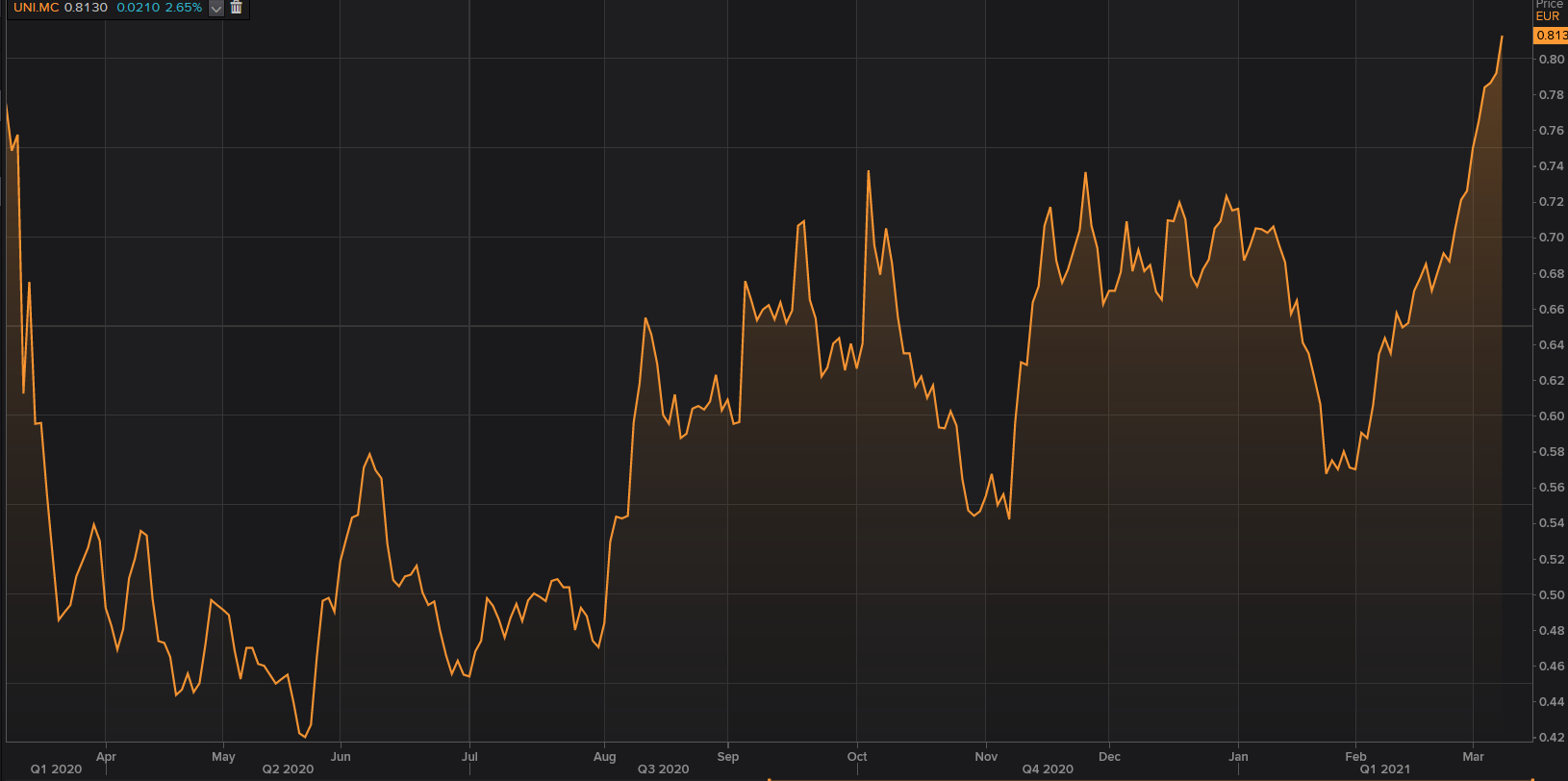 Con subidas en su acumulado de casi un 14%, los títulos de Unicaja Banco escalan posiciones en el Mercado Continuo. Las acciones del banco viven este lunes su novena sesión consecutiva al alza, y hoy cotizan por encima de los 0,81 euros.