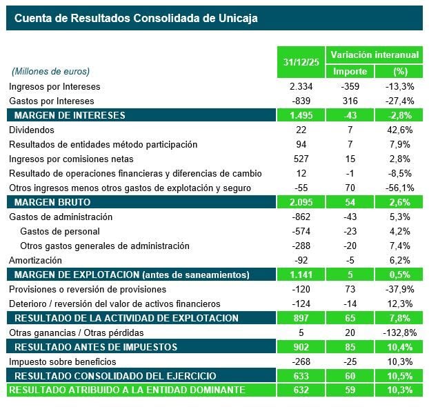Unicaja registró en 2025 un beneficio neto de 632 millones de euros, frente a los 573 millones del año anterior, lo que supone un incremento del 10,3%. Según ha comunicado la entidad, este resultado se apoya en un margen de intereses robusto, de 1.495 millones de euros, así como en el crecimiento de las comisiones netas (2,8% interanual) y la reducción de la partida ‘Provisiones o reversión de provisiones’ y de ‘Otros ingresos y cargas de explotación’, que recogía el gravamen temporal de entidades de crédito (88 millones de euros en 2024).