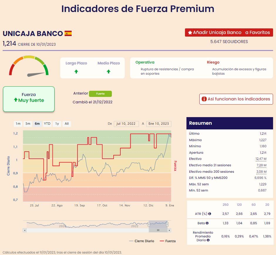 En los Indicadores de Fuerza Premium de Estrategias de Inversión, las acciones de Unicaja cuentan con un momento de mucha fuerza gracias a su tendencia alcista de largo y medio plazo, la reducida volatilidad y su gran volumen. A nivel fundamental, cuenta con ratios de valoración interesantes que le hacen tener títulos infravalorados por el mercado. Cotiza con un ratio precio-beneficio (PER) de 1,99 veces y una rentabilidad por dividendo del 4,1%. Unicaja, como otros bancos, destaca por tener acciones baratas en relación a sus beneficios y su valor contable de 0,35 veces.