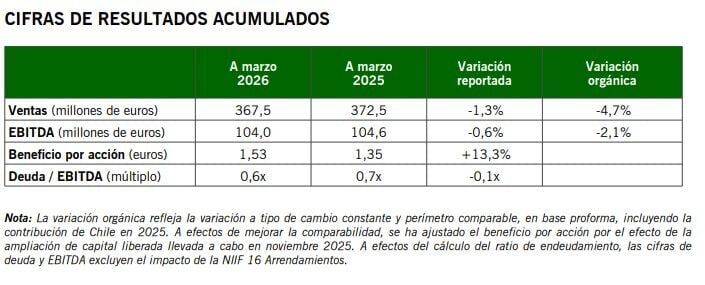 El resultado operativo bruto -EBITDA- acumulado durante los primeros tres meses de 2026 ascendió a 104,0 millones de euros. Supone una variación en términos reportados del -0,6% sobre el año anterior, reflejando una variación orgánica del -2,1%, a divisa constante y perímetro comparable.