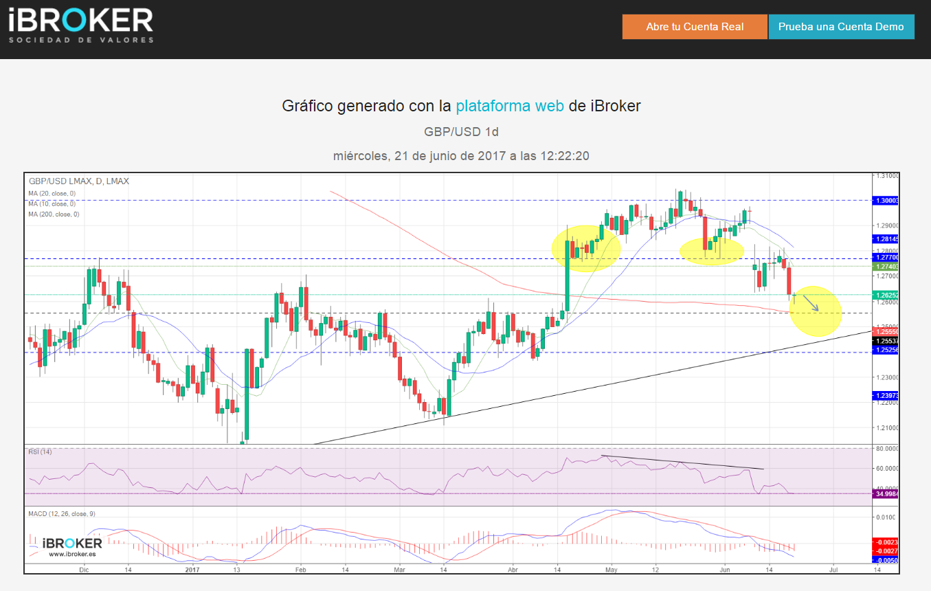 En el corto plazo ha sufrido un castigo severo después de los comicios del pasado día 8 y de testear la resistencia de 1.30 ha pasado a perforar el primer nivel de importancia 1.275, por lo que la presión vendedora podría perfectamente continuar hasta niveles de 1.255 donde la media móvil de 200 sesiones podría ejercer de soporte.