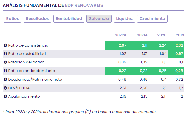 Bajo estimación para el cierre de 2021 los múltiplos de solvencia se mantienen en niveles muy aceptables. DFN/EBITDA en 2,66v y ratio Deuda neta /Patrimonio <0,5v. Buena consistencia en su balance y estabilidad.