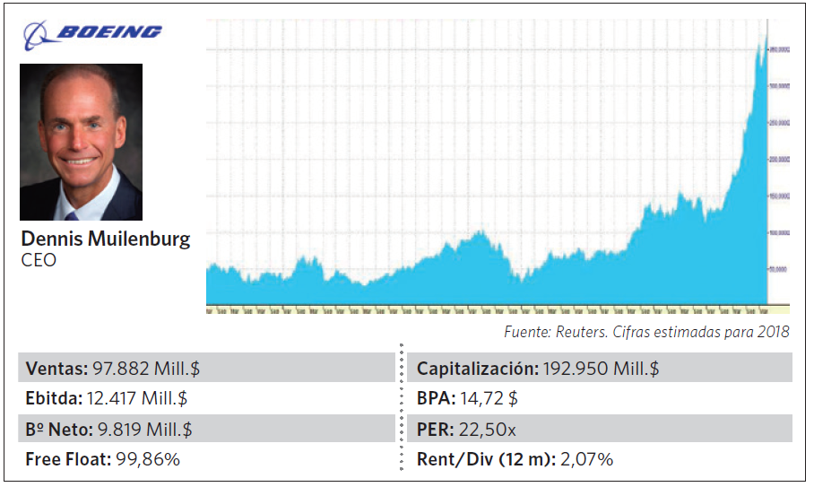 Boeing tiene clientes en más de 150 países y es uno de los mayores exportadores de Estados Unidos en términos de ventas. Está domiciliada en Chicago, cotiza en el NYSE y capitaliza en bolsa 197,4bn USD (sus principales accionistas son inversores financieros, gestoras de fondos de inversión y planes de pensiones, siendo Vanguard en principal).