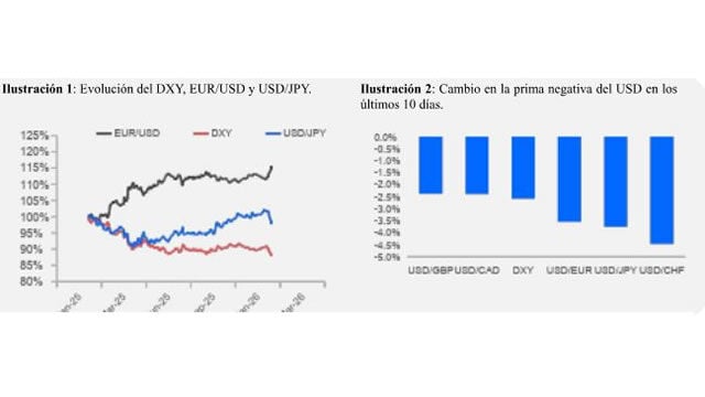 Los inversores llevan tiempo exigiendo una mayor compensación por riesgo para mantener dólares, lo que se ha traducido en una fuerte depreciación de la divisa en los últimos doce meses. El dólar lleva meses manteniendo una prima de riesgo negativa, es decir, cotizando a un valor menor al que el diferencial de tipos de interés frente a otras divisas nos indica. Durante los últimos diez días, hemos visto como esta prima de riesgo negativa se ensanchaba, reflejando la pérdida de confianza y las expectativas de depreciación de los inversores.