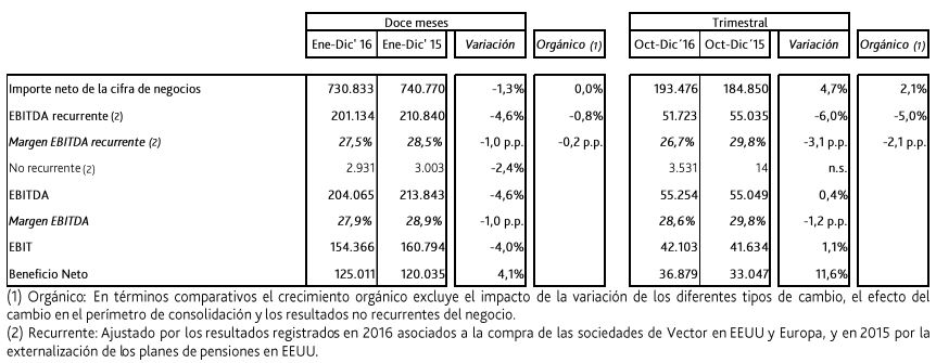 cifra de negocios del grupo descendió un 1,3% hasta los 730,8 millones de euros, lo que rompe una dinámica positiva de once años de crecimiento sostenido en ingresos.