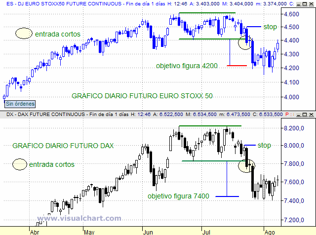 Perforación de primer soporte relativo en ambos futuros confirmando senda figuras de doble techo por lo que se puede plantear estrategia basada en apertura de posiciones cortas tras cierre de sesión o a la apertura del día siguiente buscando como objetivos de precios la altura de la figura. El stop ha de ir unos puntos por encima del máximo de la gran vela que confirma ruptura y al tick por tratarse de productos apalancados.