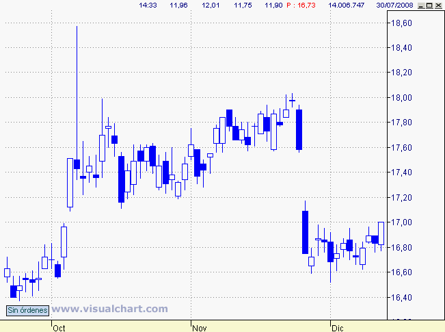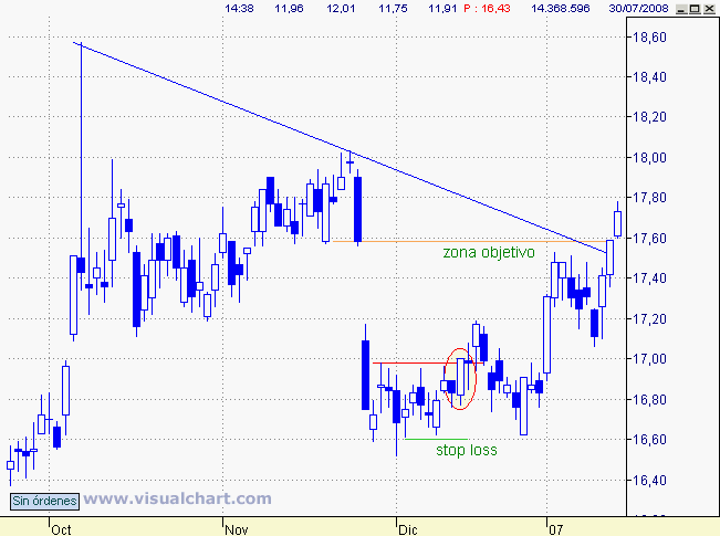 Tras varias sesiones con clara zona de frenada en entornos de 17 finalmente se produce cierre de sesión por encima de dicha cota pudiendo interpretar señal de giro alcista y por tanto estrategia con apertura de posiciones largas con stop loss en la perforación del mínimo previo, 16.60 euros, ya que ello anularía connotaciones de giro alcista. La zona objetivo viene determinada por la doble zona de barrera que a priori debe ser considerada la parte alta del hueco bajista y tangencia con directriz bajista, entornos de 17,50-60 euros.