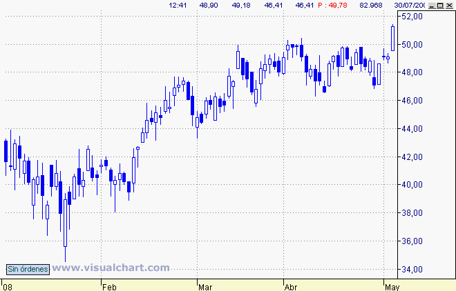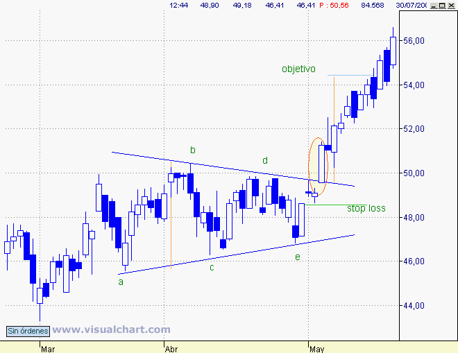 Contundente confirmación de formación triangular, no sólo por la dimensión de la vela sino también por el hueco alcista que viene a sumarse a otro previo a dicha ruptura. La apertura de posiciones largas puede hacerse bien al cierre de dicha sesión o bien en el pull back hacia zona de 50 que se produce dos sesiones después dependiendo del grado de riesgo que queramos asumir, dado que inicialmente el stop loss debe estar colocado por debajo del hueco alcista de ruptura. El objetivo mínimo de ascenso y por tanto de venta de al menos la mitad de la posición – equivalente a la amplitud del triangulo – se cumple sobradamente.