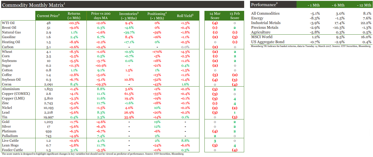 El trade de la re-inflación en los metales industriales se toma un respiro. Muchos de los metales industriales con mejor desempeño durante el mes pasado, revirtieron sus beneficios este mes. Esto se debe a que los inversores han comenzado a digerir el impacto de los grandes acontecimientos macro de marzo: el alza de las tipos de interés de la Fed y el Banco Popular de China y la decepción por la falta de detalles acerca los planes de infraestructura de la administración Trump.