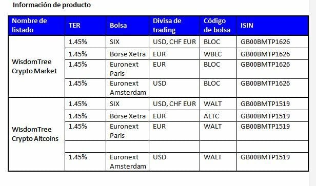 BLOC y WALT cotizan en Börse Xetra, en las bolsas de Euronext de París y Ámsterdam, y SIX, la bolsa de valores suiza. Los ETPs cuentan con un pasaporte de venta para toda la Unión Europea.