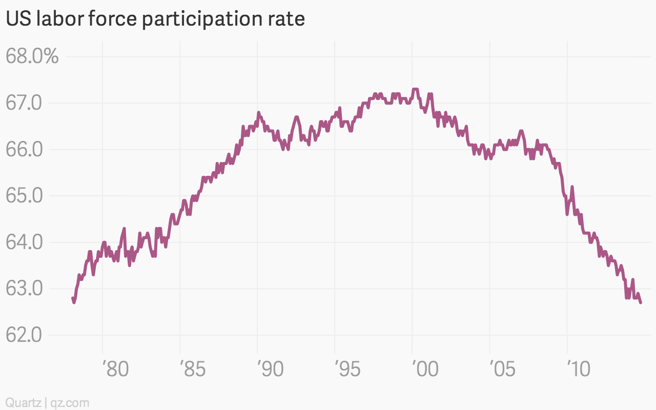 Es un poco falso, porque en seguida vemos que la tada de participación de la fuerza laboral es del 62,7% solamente, un nivel que no se ve desde 1978, lo cual deja claro, que en realidad no es que el paro está tan bajo, sino que hay muchísima gente parada a la que no se computa.