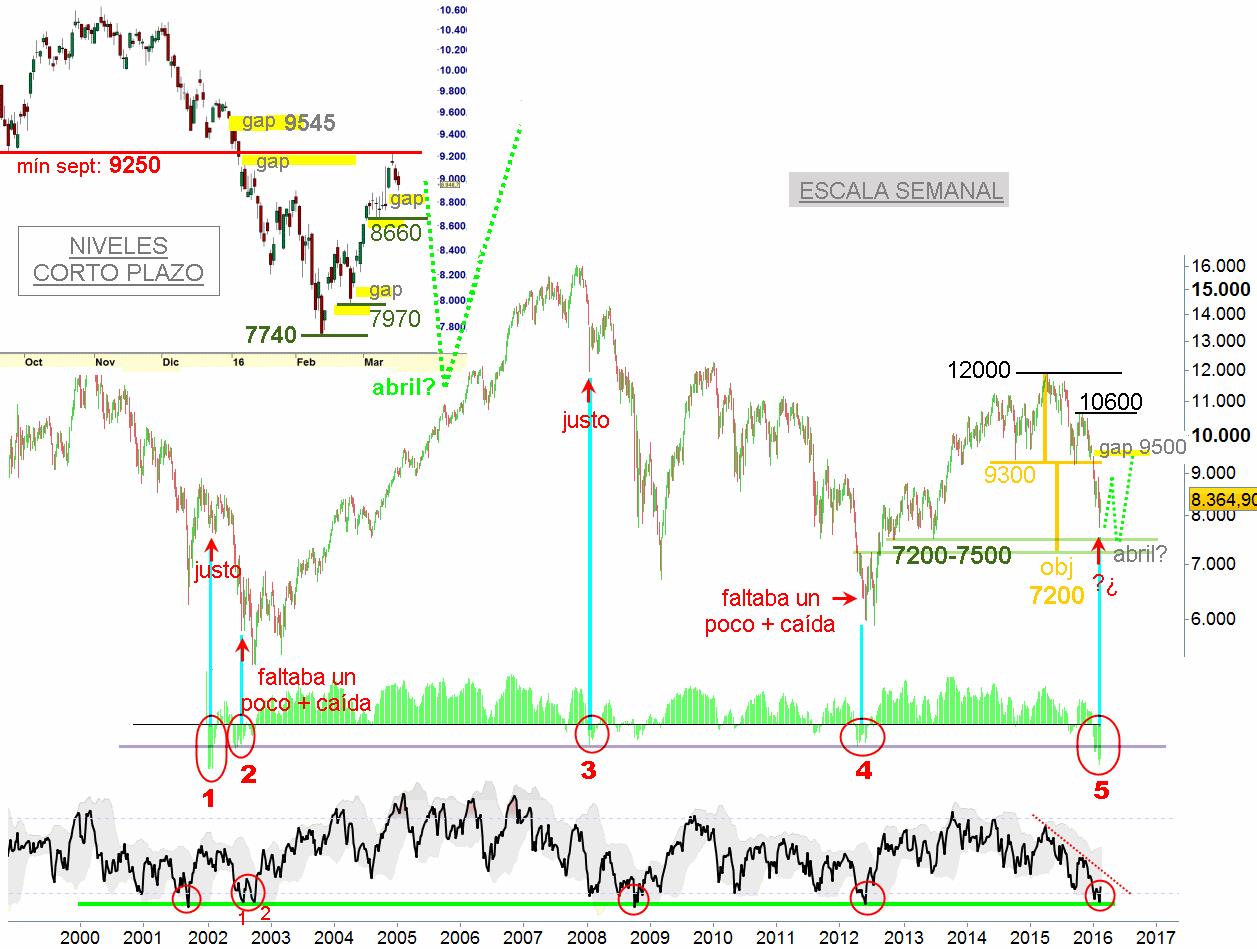 En todo caso es cierto que en escalas semanales aún se aprecia síntomas de sobreventa que habrán de armonizarse. En base a éstos, nuevas caídas a los mínimos de febrero en la zona de 8000 puntos, o en el peor de los casos hacia la zona de soporte situada entre 7200 y 7500 puntos, probablemente serían inmejorables oportunidades de compra, ¿de cara a otra reacción?