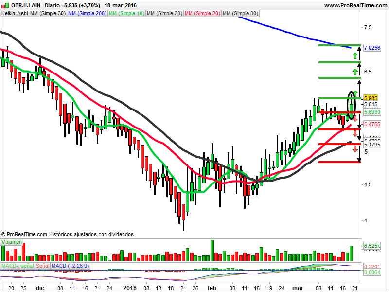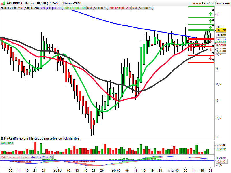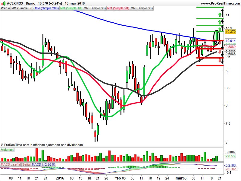 Las medias de 10, 20, 30 y 200 actúan de soportes. El volumen ha aumentado. El macd está en sobrecompra. La vela del viernes al cierre es un cuerpo real marubozu alcista. Desde la apertura al cierre los alcistas han tenido el control del valor. La vela del lunes deberá superar la resistencia de los 10,38 euros para seguir subiendo.