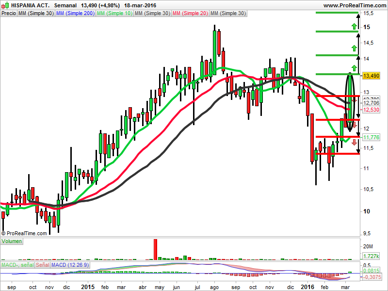 En el gráfico semanal de velas japonesas, la tendencia es alcista. Durante el 2014 estuvo en zona lateral. El mes de noviembre empezó a subir con mucha fuerza. Encontró una resistencia en los 14,87 euros, formando una pauta de harami de precio alto de giro bajista. Ha estado bajando hasta encontrar el mínimo de los 10,61 euros que le ha servido de soporte. Lo ha confirmado con una pauta de velas de martillo de giro alcista, que ha confirmado rebotando al alza. Ha superado la resistencia que tenía en los 12,91 euros.