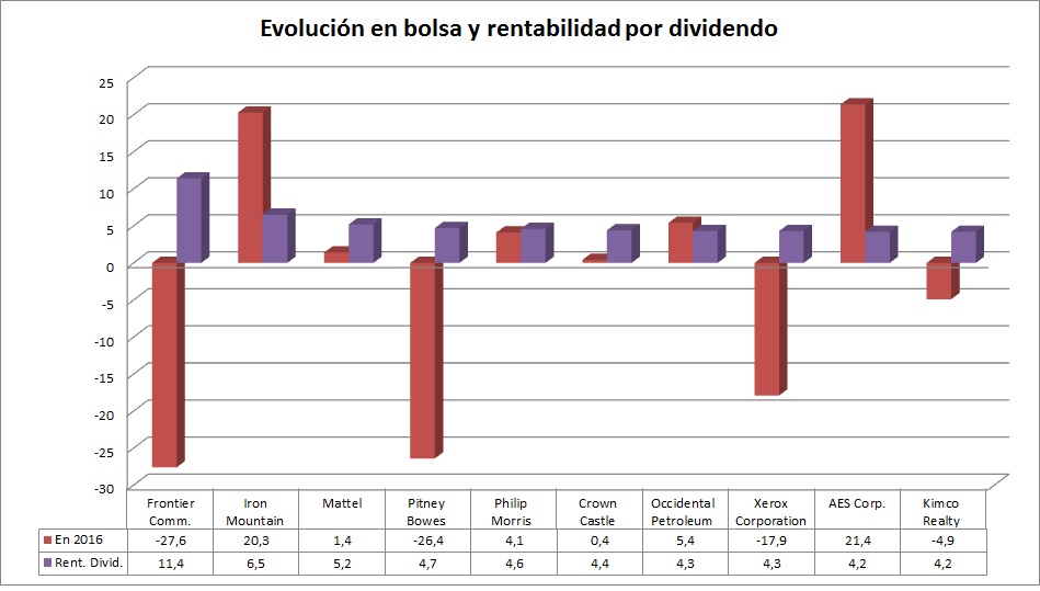 De entre estas empresas destaca Frontier Communications, la operadora tiene actualmente la rentabilidad por dividendo más alta del selectivo, al rozar el 11,5%. La compañía tiene una recomendación media de sobreponderar y un potencial de más de un 35% desde los niveles actuales. Hay que tener en cuenta, eso sí, que en la empresa se dejó el año pasado un 27,6% de su capitalización en bolsa.