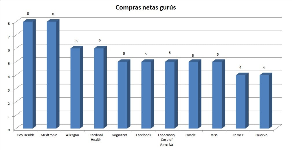 Según la web Gurufocus, las empresas que más están comprando son biotecnológicas, en concreto, Allergan, CVS Health y Medtronic. Tal y como se puede ver en la siguiente tabla, los gurús también se han sentido tentados por tecnológicas como Oracle, Visa, Facebook y Apple.