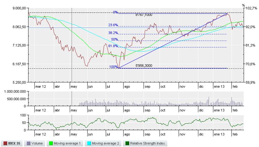 continúa montado en una barca que no se sabe bien si va a la deriva directamente o sólo zozobra. A cuatro jornadas para que acabe el segundo mes del año, hemos pasado de acumular subidas máximas del 6,8% (cuando marcó máximos el 25 de enero), para acabar perdiendo un 1% del valor con el que comenzaba el ejercicio. Un ir y venir que pone en entredicho la situación técnica del selectivo español a corto plazo. No obstante, “tras el rebote experimentado en la zona de 7.900 puntos hasta el segundo hueco bajista en los 8.350 puntos ha provocado una réplica bajista hacia el punto de reacción en 7.900 puntos”, explican desde Renta 4. El escenario que manejan en esta casa vendría a corroborar “un suelo en esa zona de cara a experimentar un rebote de mayor calado que pueda superar la zona de 8.350 puntos e, incluso acercarse nuevamente a niveles de 8.550 puntos y 8.800 puntos, para, en nuestra opinión, experimentar nuevamente réplicas bajistas”. Con este escenario cortoplacista Ana Rafels, asesora de inversiones de Ana Rafels EAFI, no recomienda tomar posiciones “hasta que no veamos otra vez al futuro del Ibex por encima de 8.200-8.250 puntos”. Además, el MACD da señales de venta marcando niveles inferiores a 0. Para más INRI, las acciones que más se han revalorizado (Bankinter, Dia y CaixaBank) apenas capitalizan un 7% del índice, y los blue chips se encuentran de la mitad de la tabla para abajo (en cuanto a revalorización acumulada en lo que va de 2013). De hecho,