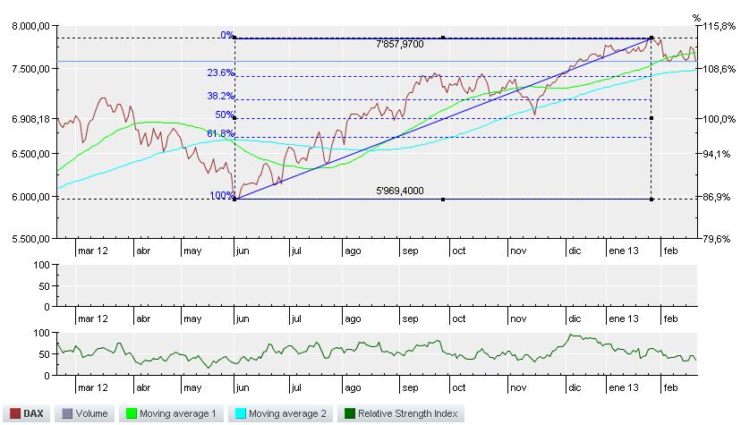 En este sentido, “habría que vigilar de cerca que el Daxno perdiera el soporte de los 7.600 puntos”, dice Roberto Moro, porque esto conllevaría un mal augurio para el resto de índices europeos. Y, precisamente, el selectivo alemán no está teniendo su mejor año. Tras el rally experimentado en 2012 a costa del mal ajeno y la huida de capitales de la periferia hacia el centro europeo, este ejercicio el Dax pierde casi un 2% de su valor y se encuentra cerca del susodicho soporte. De hecho, su RSI se encuentra en 36,7 y por debajo de 30 ya estaría indicando sobreventa. Sin embargo, como el Ibex 35, su tendencia de medio-largo plazo alcista, de momento, es innegable. “Habría que vigilar los posibles retrocesos para tomar posiciones, aunque lo más recomendable sería entrar una vez supere los 7.700 puntos y confirme la tendencia de corto plazo”, indican desde Aspain 11. En este sentido, los soportes que no debería perder el Dax si no quiere poner en entredicho la tendencia de corto plazo son los 6.950, 7.581 y 7.700 puntos.