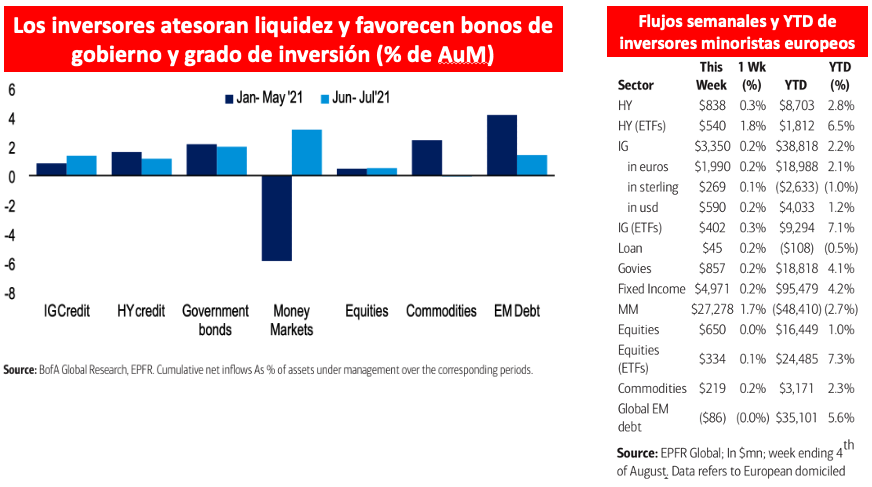 Los fondos de alta calidad crediticia registraron la décima entrada consecutiva de flujos, aunque a mayor ritmo que las anteriores. También los ETF de IG se vieron favorecidos , registrando la mayor entrada desde febrero lo que ha permitido revertir la mitad de las salidas acumuladas de semanas anteriores. También los fondos de bonos gubernamentales experimentaron suscripciones por sexta semana consecutiva, aunque de menor calado.