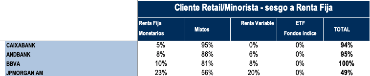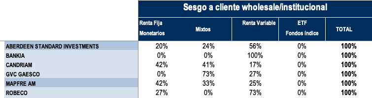 Entre las que tienen una clara orientación a minorista son: Atlas Capital, BBVA, Mediolanum, Prisma y Mutuactivos con prácticamente el 100% de sus cativos en cliente minorista. Le siguen Andbank, Caixabank, Muzinich, EDM, March y Abante con entre el 80 y 95% de sus activos en minorita.