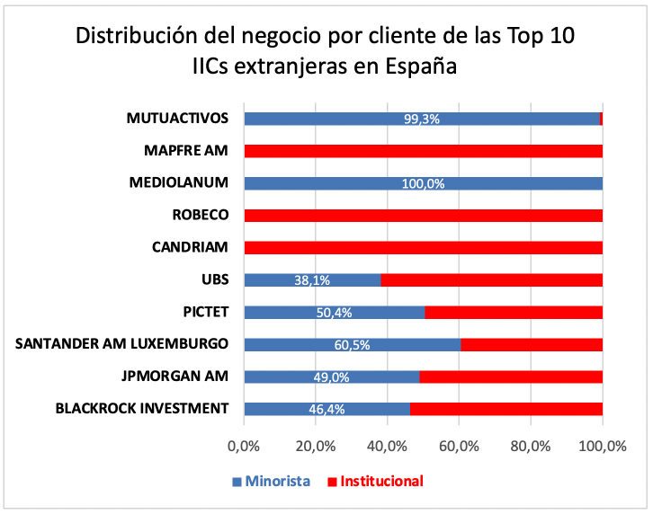 Entre las mayores IICs por patrimonio se observa que mientras que hay algunas con clara orientación al cliente minorista y otras al institucional, pero también las hay aquellas que tratan de beneficiarse de las bondades de cada segemento. Tal es el caso de Pictet, Santander AM Luxemburgo, JPMorgan y BlackRock: