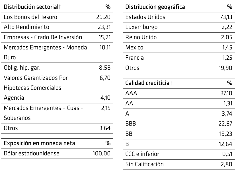Respecto a la distribución por emisor, vemos un porcentaje superior al 20% en Bonos del Tesoro y alto rendimiento (HY), también en corporativos con grado de inversión, deuda de mercados emergentes en moneda dura y cuasi soberanos emergentes, entre otros. La calificación crediticia media de la cartera es A-, con una duración media de 5,15 años y un yield to worst de 4,15%: