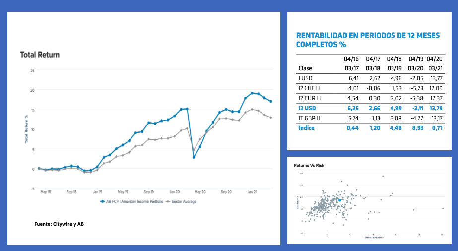 - AB American Income: se trata de una estrategia que invierte de manera diversificada en bonos denominados en dólares. Según el prospecto del fondo, los bonos pueden incluir todo tipo de valores gubernamentales y corporativos de Estados Unidos, así como bonos emitidos por gobiernos y corporativos no norteamericanos pero emitidos en dólares. La exposición mínima será de al menos el 65% en activos de emisores norteamericanos y no invertirá en aquellas emisiones cuyo rating de Moody’s y S&P sea inferior a B.
