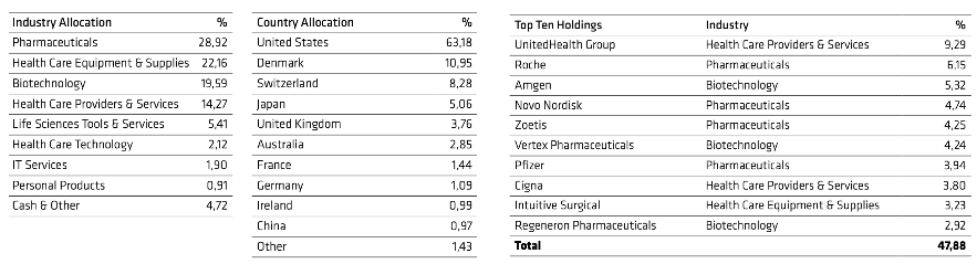 El fondo alcanza los 1.742,66 millones de dólares al cierre de abril, invertidos a través de 43 posiciones, con un active share del 63%. Entre las principales 10 posiciones (que representan el 47,88% del fondo) destacan UnitedHealth Group, con casi 9,3% de peso y que en el año ha subido en torno al 17% y más del 40% a un año; también las farmacéuticas Roche, Novo Nordisk, Pfizer y Zoetis; así como la biotecnológica norte americana Amgen con casi 5,3%, entre otras.