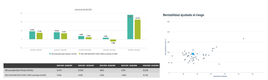 - AB Sustainable Global Thematic: y como no podía faltar, una alternativa temática mas diversificada que la anterior, y con fuerte enfoque social y medioambiental, basado al igual que los anteriores en un proceso de selección de compañías, combinando factores financieros con una adecuada gestión de acuerdo a los ODS de las Naciones Unidas. Los factores ESG están integrados a lo largo del proceso de inversión.