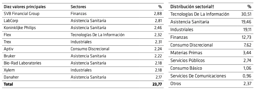 Respecto a la distribución sectorial, tecnologías de la información representa más del 30%, mientras que asistencia sanitaria e industriales casi el 20% cada uno, seguido por industriales y finanzas. La distribución geográfica, aún cuando EE.UU. pesa algo más del 60%, está muy diversificada entre países desarrollados e incluso emergentes.