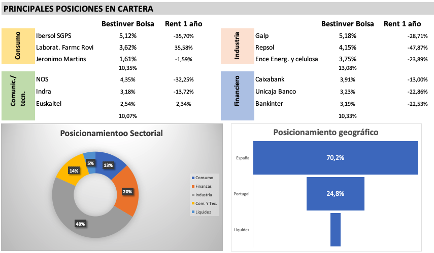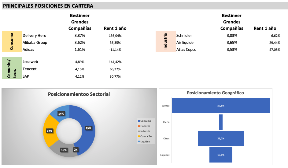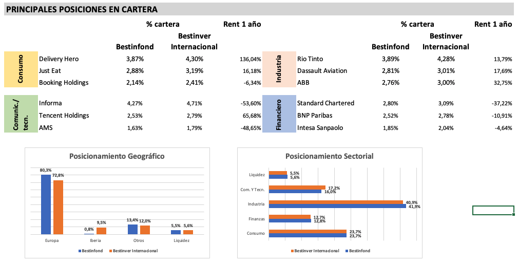 La cartera es similar en cuanto a las mayores posiciones, pero en términos geográficos es donde surgen las diferencias, ya que Bestinfond excluye España y Portugal, y por ello el peso de Europa es mayor que en el Bestinver Internacional y de ahí parte de las diferencias de rentabilidad en algunos años. Entre las mayores posiciones destaca la empresa de publicaciones e inteligencia de negocios británica Informa, que lleva una caída anual superior al 50%; la multinacional europea Delivery Hero, que como su nombre lo indica hace entrega de alimentos en línea y opera en más de 40 países en Europa, Asia, América Latina y Medio Oriente con asociaciones de más de 500 mil restaurantes y que en lo que va del año sube 41%; la minera australiana Río Tinto, que en el año sube 2,8%; Booking Holdings que cae en un año 6,2%, entre otras.