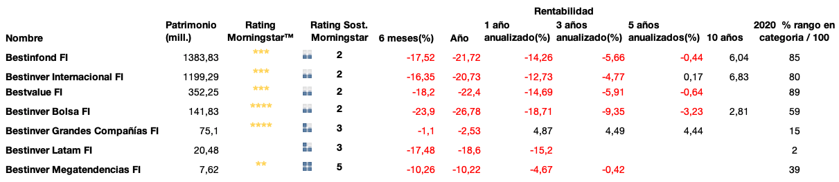 Y para terminar con la renta variable, el fondo Bestinver Grandes Compañías, un fondo que invierte en renta variable de empresas de todo el mundo, pero con una cartera muy concentrada de 25 posiciones en promedio. Gestionado hasta ahora por Beltrán de la Lastra y Carlos Arenillas. Tiene un patrimonio que se acerca a los 100 millones de euros. Su desempeño ha sido positivo en 8 de 9 años de existencia, aunque este año pierde un 2,8%, pero que es mucho menor que la caída del -5,8% del índice de referencia (MSCI World NTR).